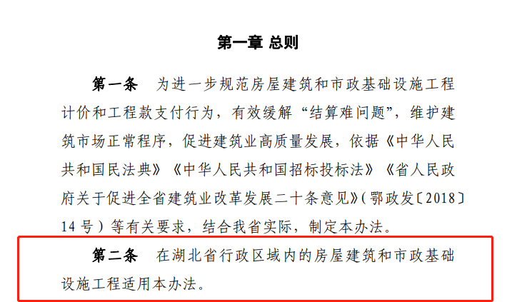 自本辦法實施之日起,湖北省內(nèi)的房屋建筑和市政基礎(chǔ)設(shè)施工程適用本辦法,不區(qū)分資金性質(zhì)。施工工程是否必須適用本《暫行辦法》,則需結(jié)合項目進展情況而定:已進行招投標或已簽訂合同的工程,仍按原約定執(zhí)行,已發(fā)包暫未確定中標單位的,招標人可發(fā)布澄清公告對結(jié)算方式進行變更,也可以按原約定繼續(xù)進行。
