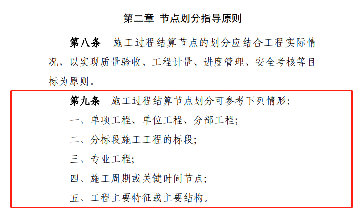 《暫行辦法》分為總則、節(jié)點劃分指導(dǎo)原則、招投標與合同約定、結(jié)算與支付、監(jiān)督管理、附則等六個章節(jié),共二十六個條文,具體如下