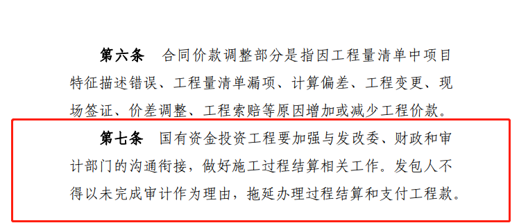 推行過程結(jié)算,建設(shè)單位應(yīng)滿足施工所需的資金安排,工程驗收通過時原則上應(yīng)同步完成工程款結(jié)算,不得變相拖延結(jié)算。國有資金投資工程應(yīng)當按照國家有關(guān)規(guī)定確保資金按時支付到位,不得以未完成審計作為延期工程款結(jié)算的理由。在以往的建設(shè)工程司法案例中,合同雙方若在合同中約定以行政審計后的價款作為結(jié)算價款的,法院予以支持。眾所周知,行政審計一般在項目驗收完成之后進行,那么在推行施工過程結(jié)算的背景下,發(fā)包人在招標文件及合同條款中再約定以行政審計后的價款作為結(jié)算依據(jù)的,明顯與過程結(jié)算的推行意義相違背。