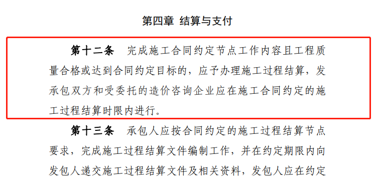 本條定義何為施工過程結(jié)算,相較住建部2021年發(fā)布的《建筑工程施工發(fā)包與承包計價管理辦法》(修訂征求意見稿)第十九條規(guī)定“全面推行施工過程結(jié)算和支付。發(fā)承包雙方通過合同約定,按時間節(jié)點或進度節(jié)點對周期內(nèi)已完成且無爭議的工程量進行價款計算、確認,并按照合同約定比例支付。”《暫行辦法》增加了節(jié)點驗收,驗收是節(jié)點結(jié)算與支付的前提。