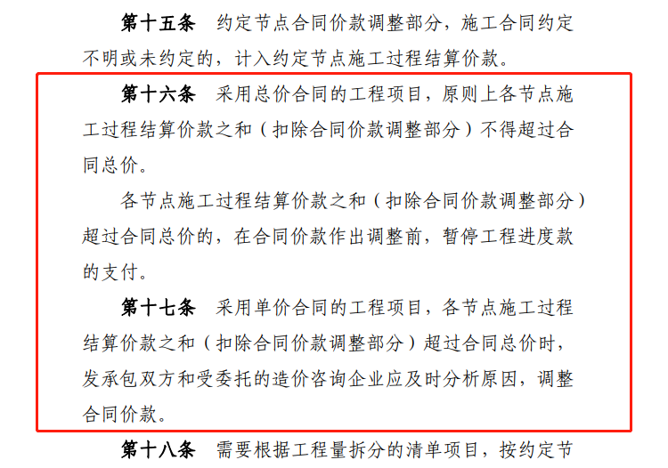 分別對總價合同的建設(shè)項目和單價合同的建設(shè)項目的施工過程結(jié)算的方式和過程進行解釋、說明。總而言之,不管總價合同還是單價合同,施工過程結(jié)算價款之和(扣除合同價款調(diào)整部分)均不得超過合同總價,否則可能出現(xiàn)工程未完成已支付完成的情況。具體支付比例可根據(jù)發(fā)包人資金使用計劃在合同中約定,但不得低于當?shù)匦姓鞴懿块T的相關(guān)規(guī)定。