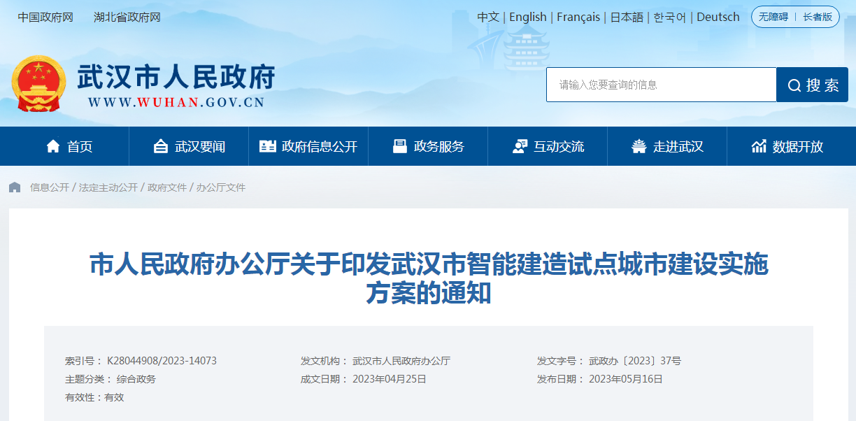武漢市人民政府辦公廳關(guān)于印發(fā)武漢市智能建造試點(diǎn)城市建設(shè)實(shí)施方案的通知