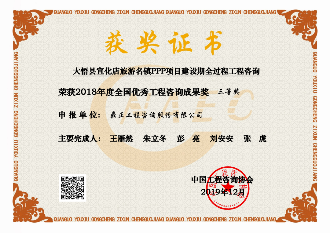 大悟縣宣化店旅游名鎮建設PPP項目開創湖北省全過程工程咨詢之先河,榮獲“2018年度全國優秀工程咨詢成果獎”三等獎,同時入選第一批省級示范項目、第四批國家級示范項目。