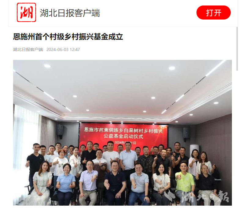 5月31日下午,恩施市芭蕉侗族鄉(xiāng)白果樹村鄉(xiāng)村振興公益基金在白果樹村正式啟動(dòng),這是恩施州首個(gè)村級(jí)鄉(xiāng)村振興基金,也是白果樹村加快推進(jìn)鄉(xiāng)村振興的最新創(chuàng)舉。