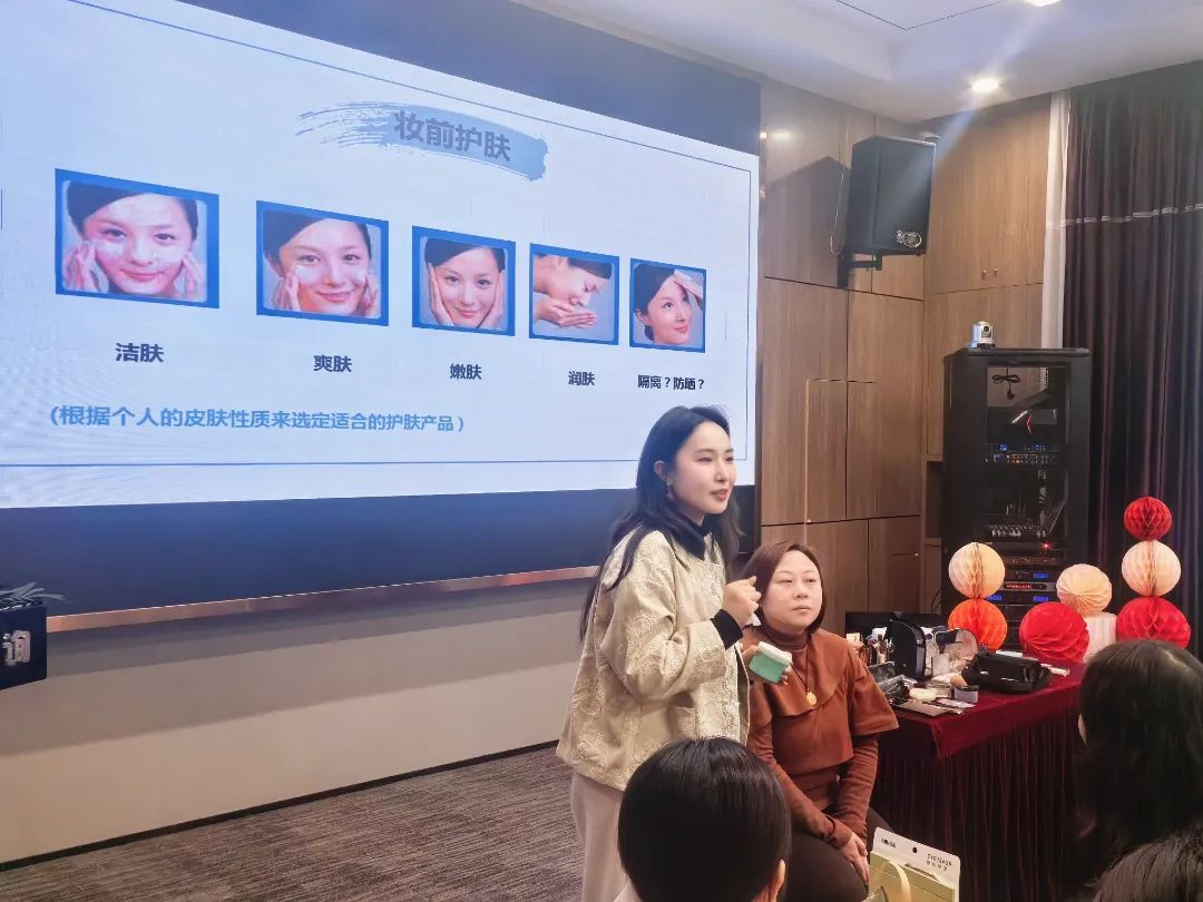 課堂上,專業(yè)美妝老師以細膩的筆觸和專業(yè)的視角,系統(tǒng)地解析了職場與生活雙場景下的妝容公式。她強調(diào),底妝是整體妝容的基石,不同膚色適合的底妝色號各不相同,精準選擇能讓妝容更加自然和諧。從職場著裝到妝容設計,從理論剖析到實操技巧,從眉形勾勒到腮紅暈染,通過現(xiàn)場演示,將每一個步驟都講解得細致入微。她手把手地指導,幫助在場的每一位女神擺脫“手殘”的困擾,傳授實用的化妝技巧,耐心解答每一個疑問。