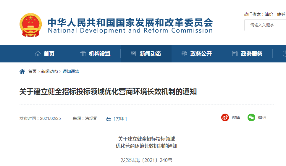 關于建立健全招標投標領域優化營商環境長效機制的通知