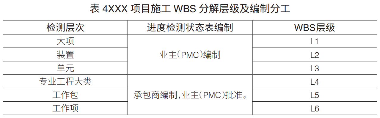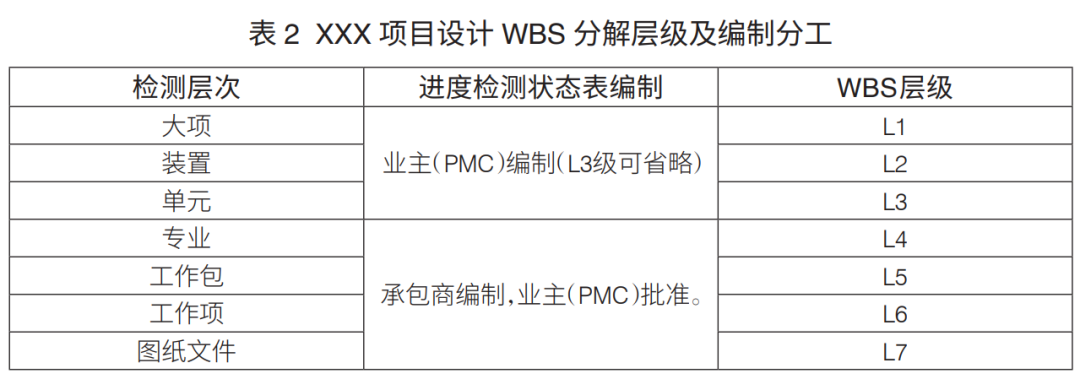 工程項目WBS分解層級:工程項目WBS分解主要是進(jìn)行設(shè)計、采購、施工WBS分解。通常,設(shè)計WBS分解至七級、采購WBS分解至六級、施工WBS分解至六級,可滿足工程管理要求(表1)。