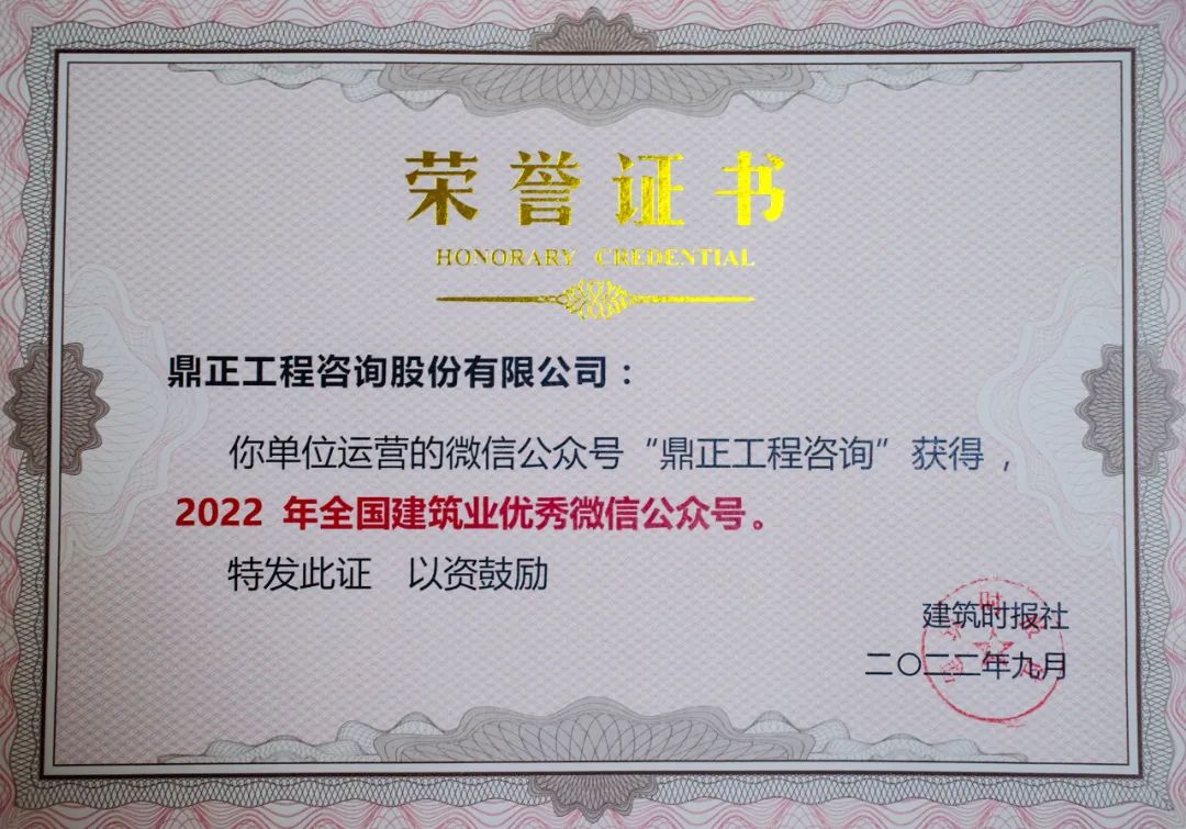9月25-26日,由建筑時報社主辦的2022建筑業(yè)微信公眾號運維經(jīng)驗交流研討會暨全國建筑業(yè)優(yōu)秀公眾號頒獎典禮在武漢舉辦。鼎正官方微信公眾號“鼎正工程咨詢”上榜全國建筑業(yè)優(yōu)秀微信公眾號榜單,榮獲2022年全國建筑業(yè)優(yōu)秀微信公眾號。