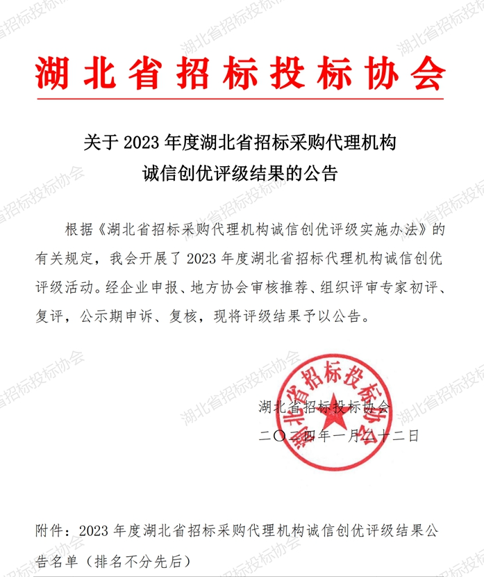 近日,鼎正憑借誠(chéng)信的經(jīng)營(yíng)理念、良好的企業(yè)信譽(yù)和優(yōu)質(zhì)的服務(wù)質(zhì)量,榮獲由湖北省招標(biāo)投標(biāo)協(xié)會(huì)認(rèn)定的最高等級(jí)“招標(biāo)采購(gòu)代理機(jī)構(gòu)信用評(píng)價(jià)AAA級(jí)信用企業(yè)”稱(chēng)號(hào)。