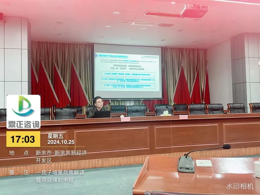自9月下旬以來,國務院等多部門密集發(fā)布了一攬子增量政策,并引發(fā)了社會各界的廣泛關注。為搶抓增量政策窗口期,提升地方政府項目謀劃儲備質量和項目謀劃水平,精準擴大有效投資。10月25日,鼎正副總經(jīng)理彭亮受邀為新余高新區(qū)政府作《一攬子增量政策解讀暨項目謀劃申報》的專題培訓。