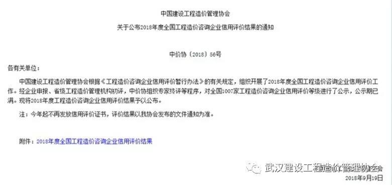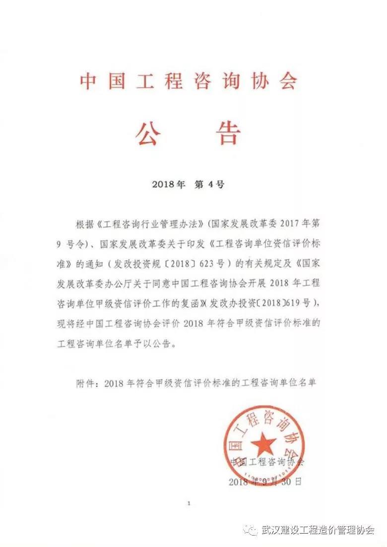2018年9月19日,中國建設工程造價管理協會發布了“2018年度全國工程造價咨詢企業信用評價結果”,此次湖北省僅有22家工程造價咨詢單位獲得AAA信用評級,我司從全國眾多參評單位中脫穎而出,獲此榮譽。