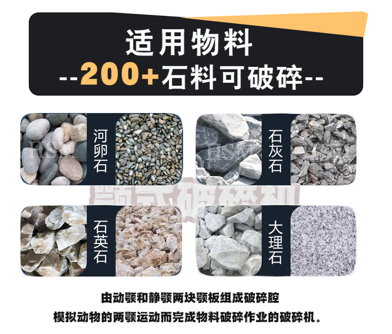 河卵石、方解石、石英、玻璃、大理石、鵝卵石、膨潤土、鐵礦石、青石、山石、水渣、石灰石、風化砂、輝綠巖、花崗巖、玄武巖等物料的破碎制砂工作。